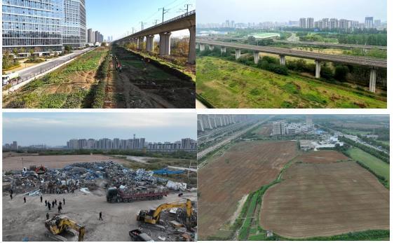 在金寨路与龙川路交口附近的宁蓉高铁沿线空旷地带,曾经垃圾遍地、开荒种地的乱象,取而代之的是绿色花园;在长丰县下塘镇,高铁沿线的烧饼广场将全新升级为精品游园,淮南铁路线与合蚌高铁之间1.9万平方米的荒地华丽变身为可以“席地而坐”的清新绿地……