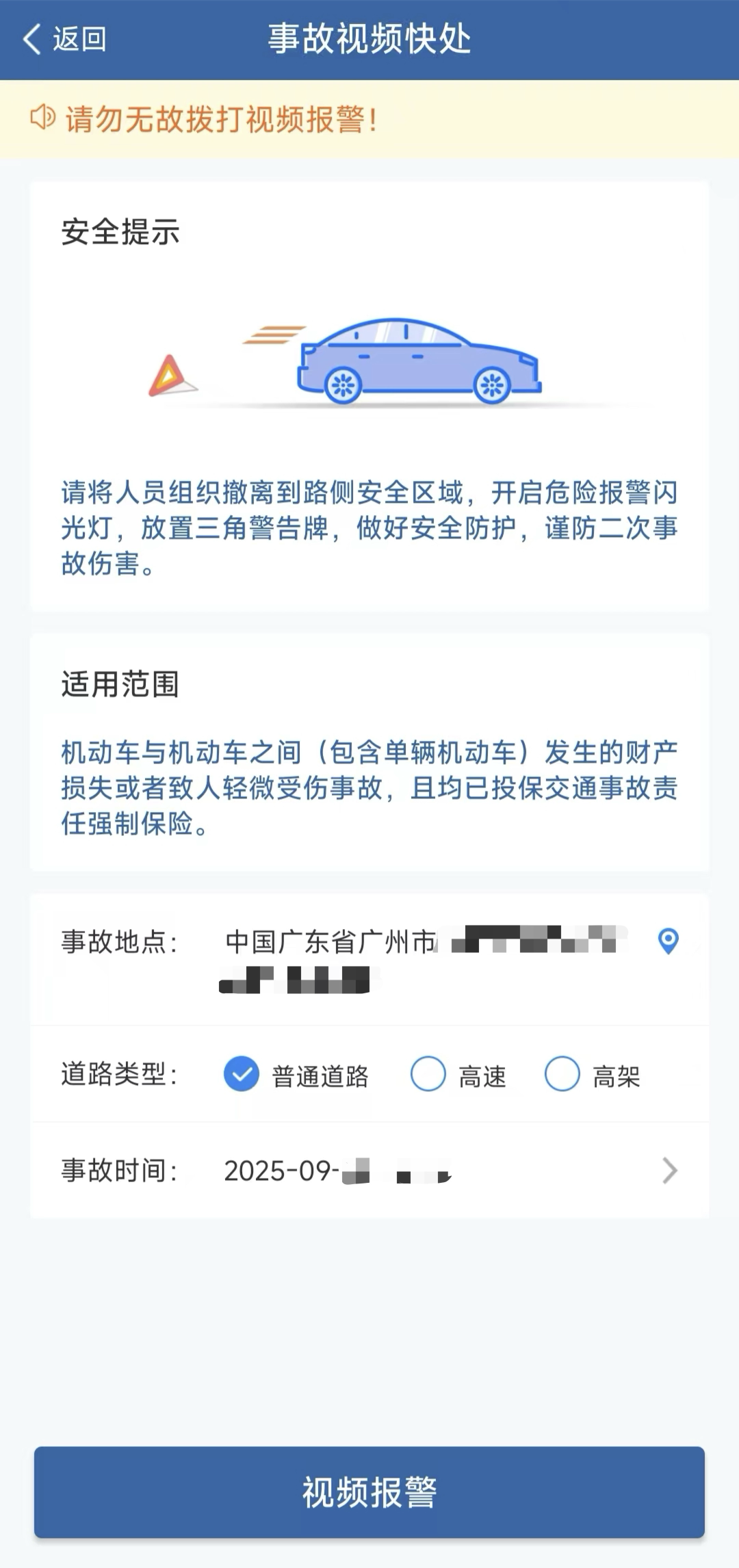 2.确认事故地址和时间,点击“视频报警”等待视频接通。视频接通后配合接警员完成事故现场信息采集。
