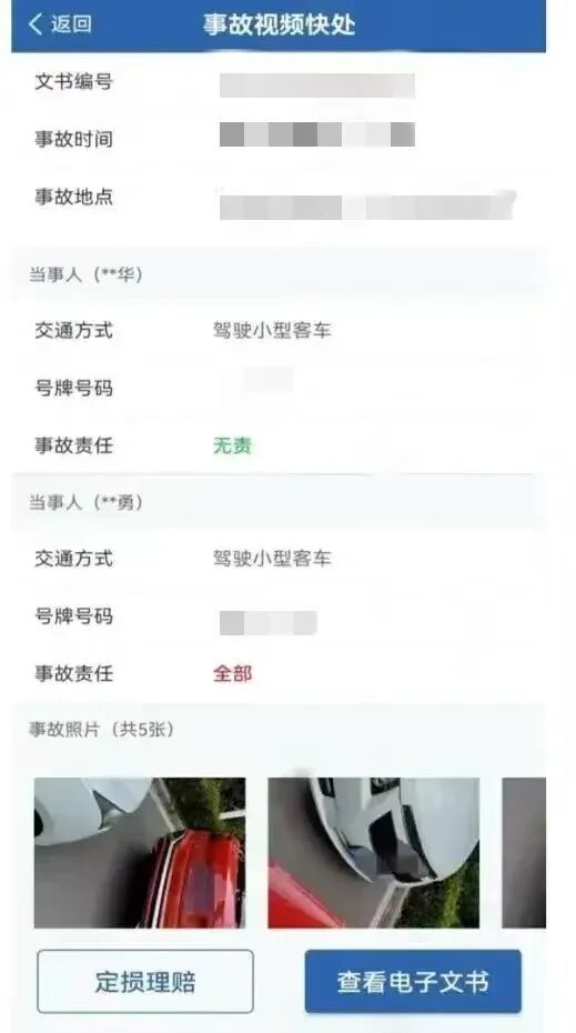 点击“事故详情”查看定责结果,右下角点击“查看电子文书”,即可查看定责电子文书。